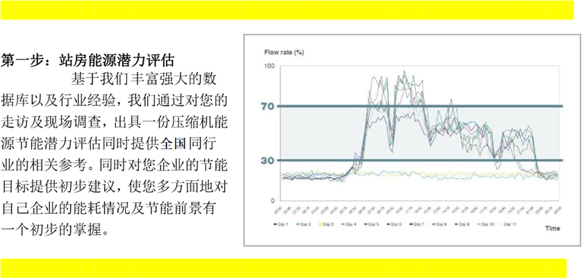 第二步:能源效率分析基于我们丰富的行业经验,我们通过专家现场测量审计,对您企业各能源环节进行深入的调查计算及分析,出具详细的节能审计分析报告。使您对您企业的压缩机的能耗状况及节能前景有一个精确的掌握。